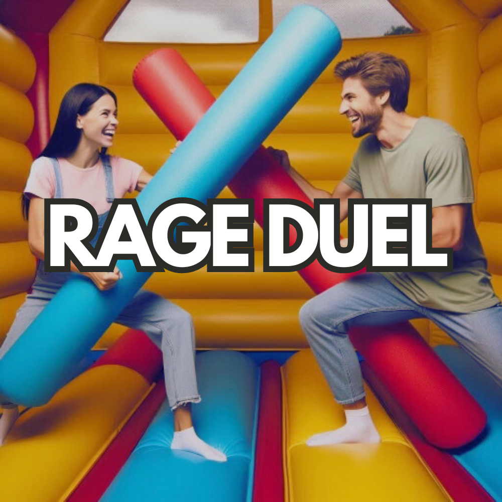 Rage Duel! A fun competitive event where 2-4 participants enter the bouncy "Rage Arena" to engage in battle! The goal is to knock your opponent off the podium by striking or pushing them with big inflatable noodles! Players who fall off are immediately eliminated from the round. There are two main gameplay modes you can choose from: "Free For All" or "King Of The Hill". In Free For All, all participants compete against one another simultaneously. You can choose to use the podiums or not. A fun all-out brawl with no alliances—every person for themselves! In Kill Of The Hill, this mode introduces a challenger format, where one person stays on the podium as the “king” after winning a round. The winner of the round remains on the podium and faces a new opponent in the next match. This continues until the king has faced all challengers. If the king is knocked off, the new winner takes their place and becomes the next king, continuing the battle with the remaining opponents. The objective is to stand on the podium for as long as possible, defeating all challengers to prove your dominance. Your success will depend on agility, strategy, and timing, as players must not only attack but also defend themselves in an all out fun filled friendly battle! Everyone is provided protective equipment & FREE custom Rage Room socks to use & take home!